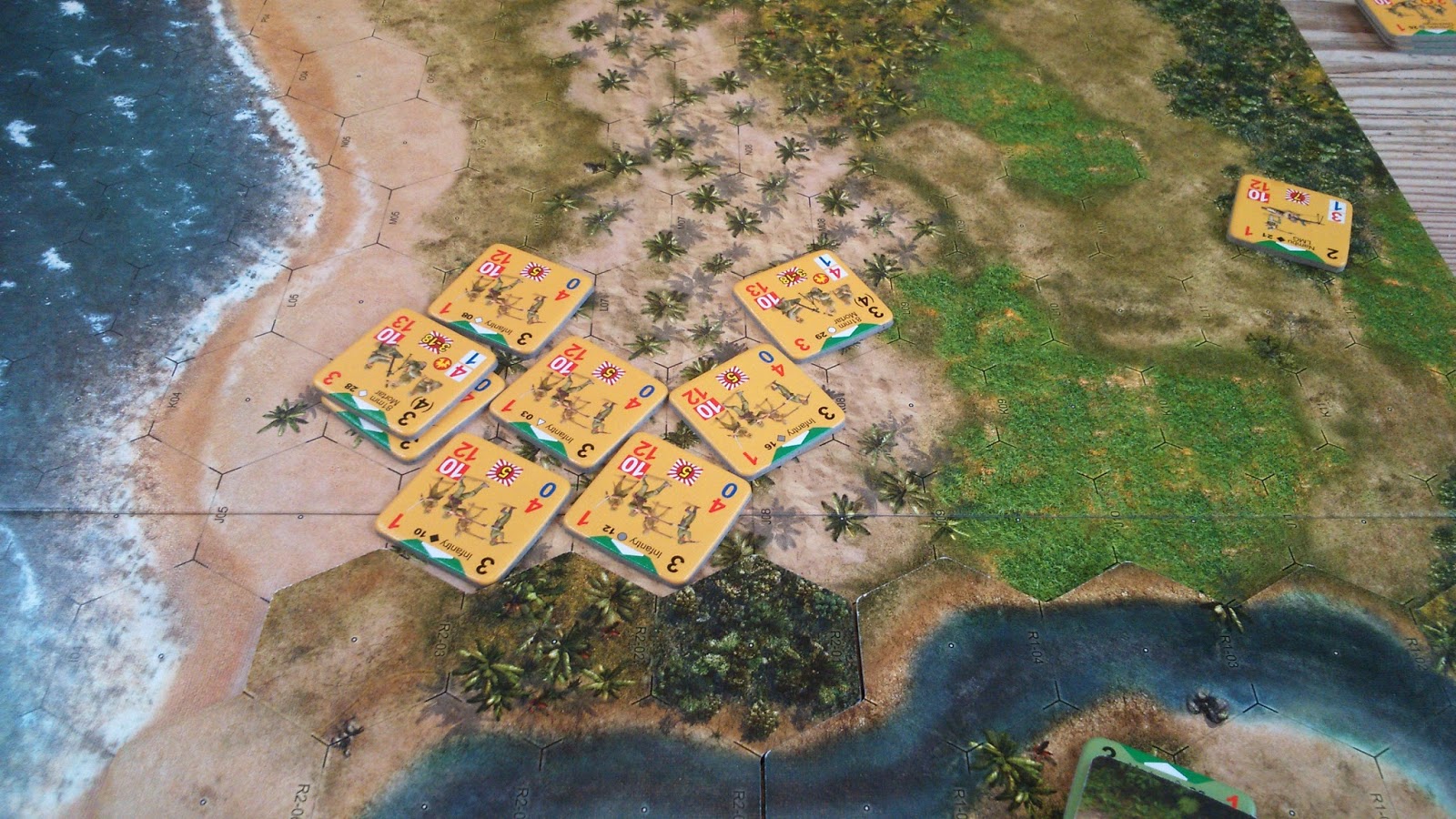 Sooo......surprisingly, I have lots of pics, even though there are no figures involved. Fortunately, I was able to choose the USMC again, as the Japs were up against it from the start. They outnumbered me by quite a large margin but I had on call artillery each move, an air strike on turn 5 (of 6 in total) and some reinforcements, including two M3 Stuart light tanks. The Japs got lots of reinforcements too, and started off with one victory point. They had some rules that restricted their freedom of movement EG negative Bushido points for any unit that did not start an activation phase as part of a group move. Every time the US killed a Jap unit, it was +1 victory point to the US, every time the Japs killed a Yank, it was +2.