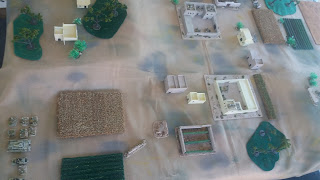 The game table I set up - two compounds with surrounding buildings, fields, woods and a hill at each end