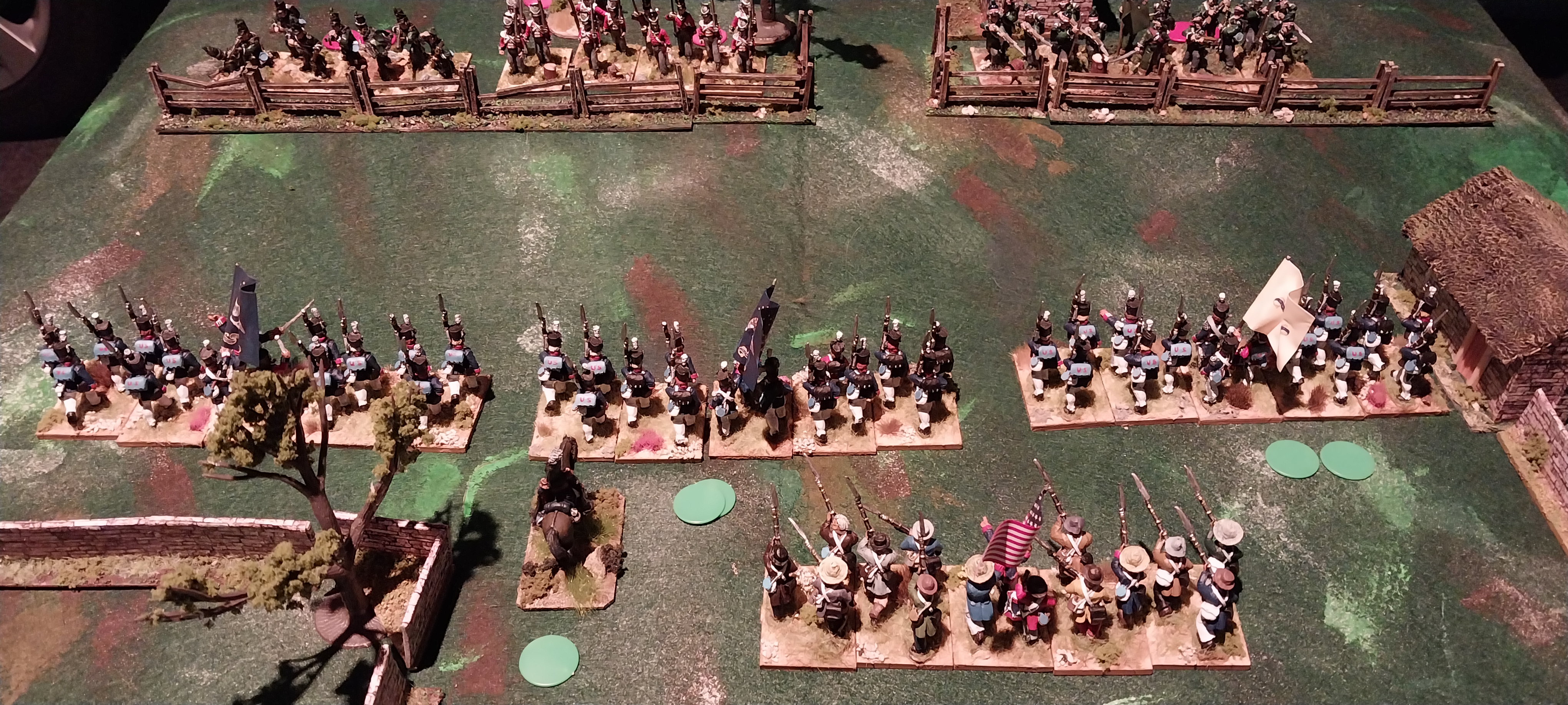 Initial set up, the Brits (at bottom) are defending behind a rail fence on slightly elevated ground. To the right are elite riflemen and to the left standard Glengarry Light Infantry. Reinforcements in the shape of an experienced Line battalion are arriving to support