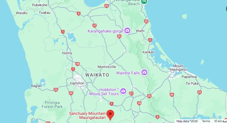 The trip from Pukekohe (top of map) to Sanctuary Mountain took about an hour and forty minutes this morning